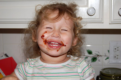 I tried to get her to taste the batter ( I know! Bad mom exposing her child to possible salmonella! But I did it when I was a kid and I'm still alive!), but at first she would have nothing to do with it. Then I turn around a minute later and this is what she's doing. Typical Maddi! It has to be her idea! I don't give her too many sweets often so she really liked this once she got going!